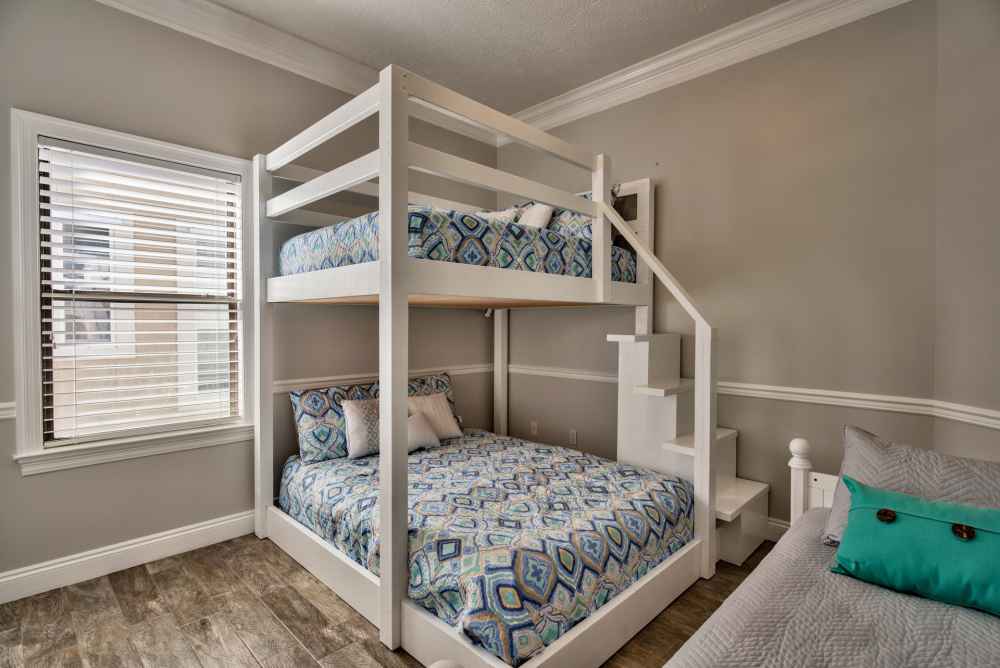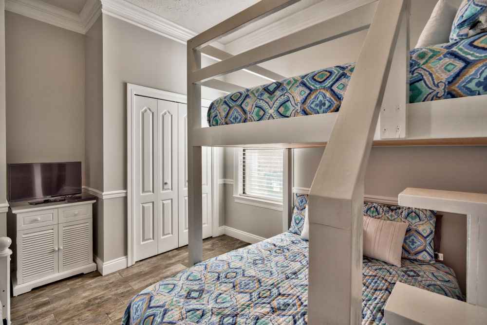 Bedroom 2: Bunk Room. Featuring a fort like bunk set-up that is a kid’s favorite. FULL over FULL bunk bed and a twin bed next to it. Full bath is shared with Bedroom 1 and also provides access from the hall. Large Flat screen TV. Sleeps 5.